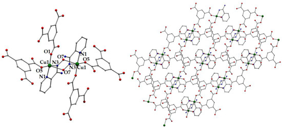 Compound 3 crystallizes in the monoclinic space group P21/n. Its structure consists of a two-dimensional network based on the dinuclear centrosymmetric repeating unit [Cu2(Hbtc)2(H2pyaox)2] (Figure 3). The two metal ions within the repeating unit are held together through the two bridging H2pyaox ligands, and their distance was 4.397 Å. The coordination sphere of CuII was completed by two Hbtc2− ions, which also linked the neighbouring SBUs resulting in the formation of a 2D framework. The metal ions were penta-coordinated and adopted a square pyramidal geometry (τ = 0.05) with O7 from the oximic group occupying the apical position [78].
