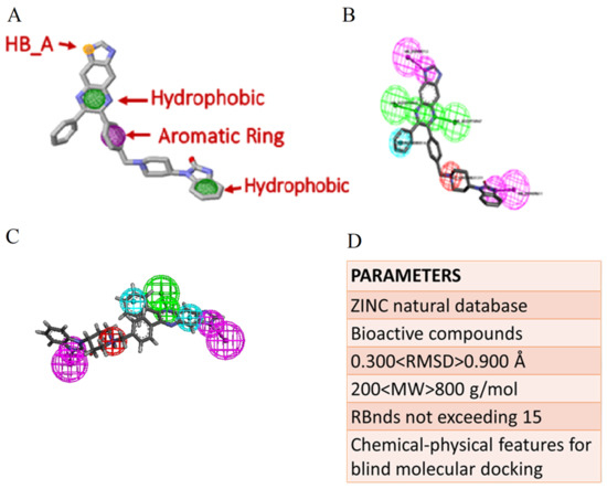 Pharmacophore models make it possible to perform a large-scale screening of compounds applying several filters, to find good candidates to bind a target protein. A “good” candidate should be able to map all the parameters and all the chemical–physical characteristics required to carry out its biological activity. The compounds that match a well-defined pharmacophore have been analyzed through direct focused molecular docking for selecting only the best candidates and studying the protein–ligand interactions, taking into account the parameters related to the lowest binding energy and the estimated inhibition constant (Ki). This allowed us to evaluate which is the most stable complex and which is the compound that used at lower concentration is able to give the same biological results as the compounds used at higher concentrations.