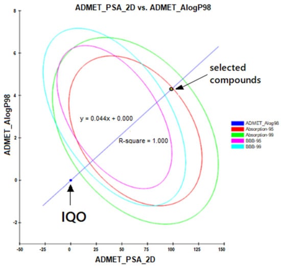 ADMET plot. The ADMET plot shows the relationship between the 2D polar surface area and the partition coefficient (n-octanol/water) algorithm, of the solution in which the bioavailability of the vitamin E compounds is calculated. The four ellipses define the regions where the inhibitors are expected to be well absorbed by the system and where they are expected to be located. In theory, for intestinal absorption, the inhibitors are well absorbed between 95 and 99% of the established confidence interval, if they fall within the ellipses colored in red and green, respectively. While, for absorption at the level of the blood–brain barrier, the inhibitors are well absorbed between 95 and 99% if they fall within the ellipses colored in magenta and cyan, respectively.