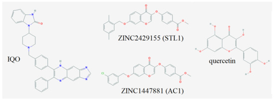 At the end of the computational study, the compounds we selected for the experimental validation were ZINC2429155 (also named STL1), ZINC1447881 (also named AC1) and ZINC02161363, having binding energy values in the range of −9/−10 Kcal/mol, Ki in the range of 1–2 μM, and favorable toxicity profiles. However, ZINC02161363 has not been tested for technical problems related to solubility. Figure 5 shows the molecular structure of the compounds selected for the experimental assays, together with IQO (also named iAKT-S), used as a positive control being a known inhibitor of AKT1. The structure of quercetin, used as a negative control, is also reported in Figure 5.