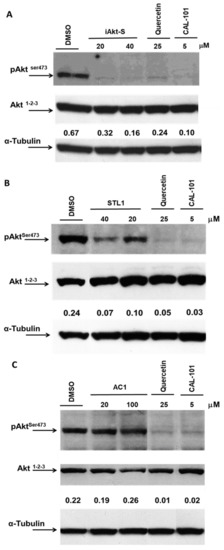Effect of AKT inhibitors HG3 cells. Cells (1 × 106/mL) were treated for 1 h with DMSO (0.1% v/v), quercetin (25 μM), CAL-101 (5 μM) and iAKT-S (IQO, 20–40 μM) (A); ZINC2429155 (STL1, 20–40 μM) (B) and ZINC1447881 (AC1, 20–100 μM) (C). Immunoblots were performed using the anti-phospho-AKT (p-AKT) antibody (upper panel). After two rounds of stripping, the blot was reprobed using the anti-AKT1-2-3 antibody (middle panel) followed by the anti-α−tubulin antibody. Densitometric analysis was calculated measuring optical density of p-AKT bands normalized respect to the expression of AKT and α-tubulin (pAKT/AKT/α-tubulin; numbers between the middle and lower panels). The blots are representative images of three independent experiments.