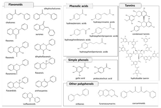 Polyphenols are one of the largest and most complex classes of SMs produced by plants, derived from shikimate biosynthesis pathway, which provides precursors for aromatic molecules. Based on the biosynthetic pathway, the number of aromatic rings, carbon atoms, and hydroxyl groups, they are divided into different sub-classes such as: simple phenols, phenolic acids, flavonoids and tannins (Figure 2).