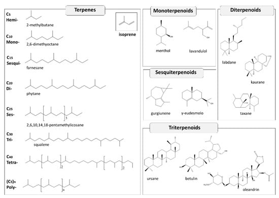 Terpenes, also termed terpenoids or isoprenoids, constitute a large family of natural products extremely diversified in their structure, functions, and properties. Terpenes derive from mevalonic acid biosynthetic pathway. However, since their decomposition generates isoprene units (C5), this compound has been defined as terpene’s basic constituent. For this reason, these SMs are classified based on the number of isoprene units present in their structure, and generally condensed head-to-tail. Following this rule they are divided into hemiterpenes (C5H8), monoterpenes (C5H8)2, sesquiterpenes (C5H8)3, diterpenes (C5H8)4, sesterterpenes (C5H8)5, triterpenes (C5H8)6, etc. [101] (Figure 3).