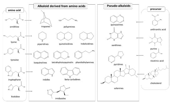 Following this classification criterion, another class of alkaloid, namely “pseudo-alkaloids,” was constituted, including compounds that do not originate from amino acids, while having a nitrogen atom inserted into the molecule by transamination or amination reactions (Figure 4). This letter class includes aromatic alkaloids, ephedra alkaloids, purine alkaloids, sesquiterpene alkaloids such as isoprenoid alkaloids including mono- (from geraniol), di- (from geranylgeranyl-PP), and triterpene (from cholesterol) derivatives, these latter called steroidal alkaloids [158].