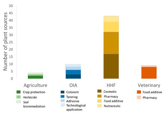 Actually, the high added-value molecules still contained in plant wastes and by-products offer a wide spectrum of possibilities for their valorization and reuse, as foreseen by circular economy [15,16]. For example, from agri-food wastes it is still possible to extract macromolecules such as nucleic acids [17], pectins [18], cellulose material [19], and enzymes such as bromelain, which is derived from pineapple residues and extensively used as a pharmaceutical and meat tenderizer [20]. Primary metabolites (i.e., organic acids, amino acids, carbohydrates) can also be obtained from plant waste material and used for different purposes [21]. Plants in particular produce secondary metabolites (SMs), which are not directly involved in the basic functions of growth, development, and reproduction of the organism, but are essential for long-term survival and play multiple roles, including defense against predators or attraction of pollinators [22]. SMs are endowed with numerous biological activities, making them also extremely important for human health and well-being. Moreover, due to their chemical and biological properties, SMs have also found application in many other fields, serving as pigments, cosmetics, antifeedants and so on [23].