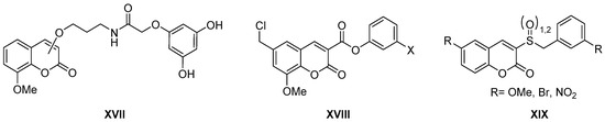 Regarding the anti-inflammatory activity, it is worth mentioning a review on the coumarins of natural origin (simple coumarins, prenylcoumarins, furocoumarins, coumestans, and benzocoumarins) with a detailed anti-inflammatory activity due to the activation of the nuclear factor erythroid 2-related factor 2 (Nrf2 factor) that protects cells against stress oxidative [30]. In other cases, the anti-inflammatory activity found for coumarin esters (Figure 4, general structure XVIII) as inhibitors of the Kallikrein-related peptidase 9 (KLK9) involved in inflammatory processes of the skin is reported [31]. Finally, the replacement of the carboxylic group by a sulfone or sulfoxide group (Figure 4, general structure XIX) gives rise to new inhibitors of cyclooxygenase-2 (COX-2) with activities comparable, in many cases, to indomethacin [32].