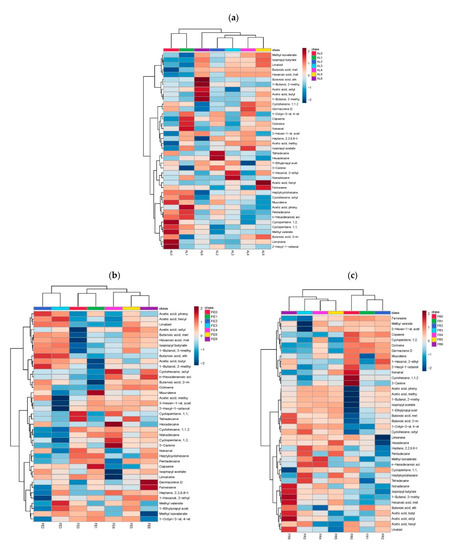 The heat map and hierarchical clustering analysis of metabolic profiles from maturation stages of the strawberry fruits. Rows: Volatile organic compounds (VOCs) identified; columns: maturation stages. The correlation matrix is represented by a color gradient in which dark blue indicates a negative correlation and dark red indicates positive correlation (Pearson Correlation Coefficient). This color matrix results in the grouping tree shown at the top of the figure, which groups the phenological maturation stages that do not differ significantly from each other on the same branch, and separates stages that do differ significantly on different branches; (a) heat map for var. Albion; (b) heat map for var. Festival; (c) heat map for var. Frontera.
