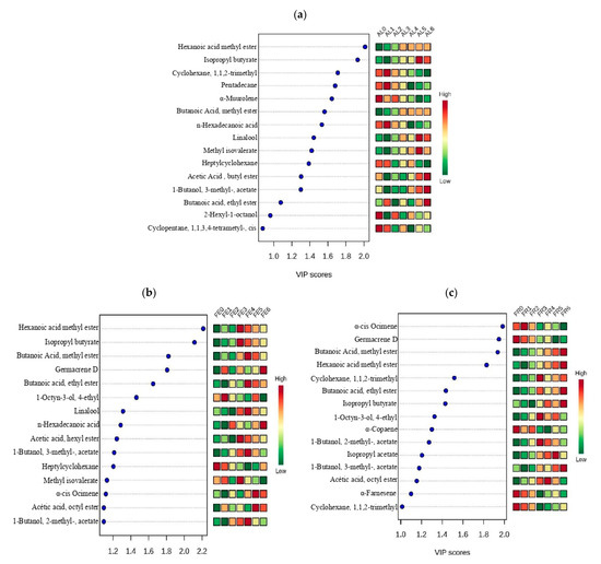 Variable importance in projection (VIP) graph showing the 15 most important VOCs in descending order. The degree of importance during each phenological stage is shown by the color gradient, in which red indicates a high correlation and green a low correlation. VIP score is a measure of a variable’s importance. (a) VIP var. Albion; (b) VIP var. Festival; (c) VIP var. Frontera.