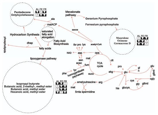 Metabolic pathways for the synthesis of the main VOCs detected in the Variable importance in projection (VIP) graph for fruits of the three strawberry varieties during the seven stages of maturation. The nine most important metabolites are classified into three chemical families; Compounds with white triangles facing upwards represent the highest total concentrations for the variety indicated on the labels, on the other hand, compounds with a black triangle facing downwards represent a lower total concentration of the metabolite for the variety indicated on the labels.