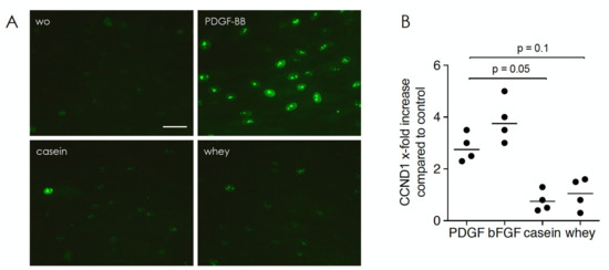 Casein and whey powder at 1% have no impact on cell proliferation. Gingival fibroblasts were incubated for 24 h with 1% casein and whey powder, as well as with 100 ng/mL of the mitogens PDGF-BB and 50 ng/mL bFGF. (A) Immunostaining for Ki-67 protein (also known as MKI67), a cellular marker for proliferation and (B) the expression of the cell cycle regulator cyclin D1 (CCND1) were determined. Data were normalized for the untreated control being “one”. Statistic was based on a Friedmann test. Scale bar indicates 100 µm. “wo” stands for without, indicating the unstimulated cells.