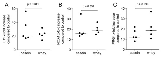 First, the amount of TGF-β1 in the aqueous fraction of 1% casein and whey powder was measured by immunoassay showing median levels of 755.4 pg/mL (min 570.0, max 930.0) and 77.4 pg/mL (min 74.0, max 100.0), respectively. In aqueous fraction of total cow milk, median levels of TGF-β1 were 532.0 pg/mL (min 309.0, max 1161.1). Next, gingival fibroblasts were exposed to the aqueous fraction of casein and whey powder. With 1% casein and whey powder, transcript levels of IL11, NOX4 and PRG4 were increased in gingival fibroblasts using GAPDH for normalization (Figure 3). More insights are provided by showing that the increase of TGF-β target gene is independent of the manufacturer of the casein and whey powder (data not shown).