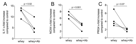 TGF-β pan specific neutralizing antibody reduces whey TGF-β activity. Gingival fibroblasts were exposed to 1% whey powder with and without 10 ng/mL of a TGF-β pan specific neutralizing antibody for 24 h followed by expression analysis of (A) IL11, (B) NOX4 and (C) PRG4. Data points represent fold change of independent experiments compared to the unstimulated controls. Statistical analysis was based on paired T-test.