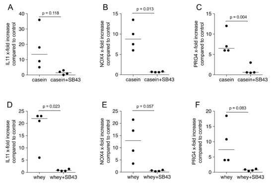 Casein and whey powder formulation enhances TGF-β target genes via TGF-β RI kinase. Gingival fibroblasts were exposed to 1% of a reconstituted pooled casein (A–C) and whey (D–F) powder with and without the TGF-β RI kinase inhibitor SB431542 (SB43). Expression analysis of (A,D) IL11, (B,E) NOX4 and (C,F) PRG4 was performed with RT-PCR. Data points represent fold change of independent experiments compared to the unstimulated controls. Statistical analysis was based on paired T-test.
