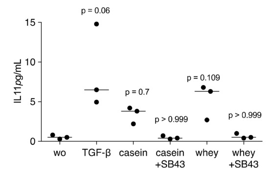 We further determined that the TGF-β receptor I kinase inhibitor SB431542 can neutralize the effects of casein and whey powder. Pharmacological inhibition of TGF-β receptor I kinase blocked the response of gingival fibroblasts to processed casein and whey powder based on the expression of IL11, NOX4 and PRG4 (Figure 5). In agreement with the findings based on the transcription, also IL11 protein release into the supernatant was prevented by SB431542 (Figure 6). Moreover, IL11 protein levels in the respective supernatant were increased, again at a similar magnitude between casein and whey (Figure 6).