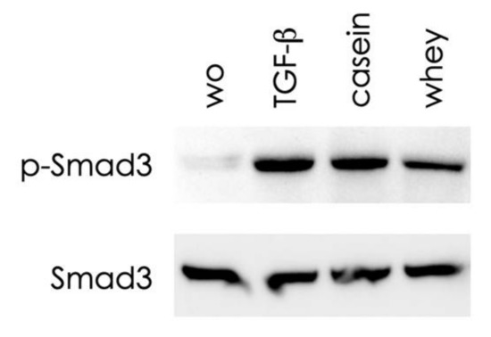 Casein and whey powder enhance phosphorylation of smad3. Serum-starved gingival fibroblasts were exposed to 1% of a reconstituted pooled casein and whey powder for 30 min before being subjected to Western blot analysis of phosphorylation of smad3. Cells exposed to recombinant TGF-β and casein and whey powder caused a strong increase in the phosphorylation of smad3. “wo” stands for without, indicating the unstimulated cells.