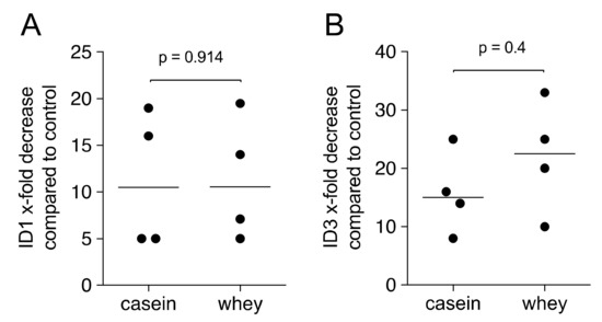 ID1 and ID3 expression in HSC2 exposed to casein and whey powder. HSC2 oral squamous cell carcinoma cells were exposed to 1% casein and whey powder for 24 h, before expression analysis of the target genes (A) ID1 and (B) ID3 were performed. Data indicate the x-fold decrease compared to unstimulated control cells. Statistical analysis was based on Mann–Whitney U test.