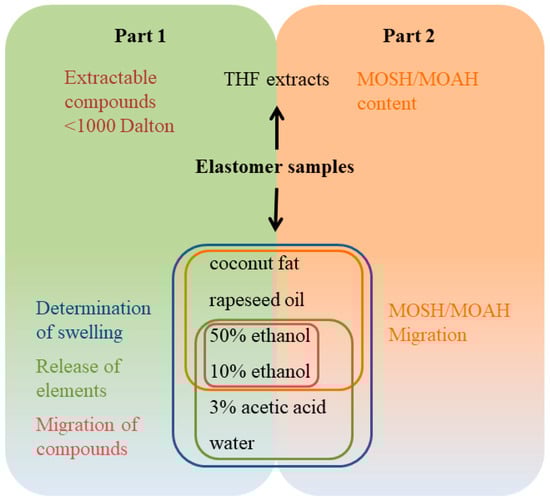 Migration of noncovalently bound substances from such chemically diverse polymers as elastomers is dependent on the polarity of the polymer matrix, the substance and the food simulant or extraction solvent. In the past, investigations on the migration of substances from elastomers into food or food simulants has often focussed on selected chemical classes such as primary and secondary aromatic amines [6], (mercapto)benzothiazole [7] and N-nitrosamines [8,9,10,11,12]. However, untargeted screening for extractables from FCMs has provided evidence that many more substances may migrate from rubber [13,14,15]. Extractable/migratable substances in rubber may originate from impurities of starting materials or reaction and degradation products. As described above, elastomers represent a very heterogenic class of material. Hence, the variety of compounds, which are to be expected, is vast. For risk assessment, however, the decisive factor is what substances reach the food. To investigate this, food simulants play an important role. It was the aim of the present work to further elucidate which and to what extent substances from different food contact elastomers may find their way into our food. In the first part of the project, ten different elastomer samples were evaluated with respect to the content of extractable compounds, migration of substances into ethanolic food simulants, swelling in food simulants and release of elements in different food simulants. The second part of this work takes a closer look at one part of extractable/migratable substances, namely mineral oil hydrocarbons (MOH). The content of MOH, as well as migration into food simulants, was investigated. Figure 1 illustrates the general content of the study described.