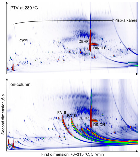 The THF extracts were injected by a programmable temperature vaporiser (PTV), while the MOSH or MOSH and MOAH depleted extracts were injected on-column. PTV injection is useful for the discrimination of low-volatility components and highly polar substances, which are partially adsorbed on glass wool [17,18]. On-column injection, however, mitigates the risk of new substances forming in the hot injector chamber. Due to large signals from, e.g., fatty acids, this can lead to a substantially different appearance of the GC × GC chromatograms, as is shown in Figure 2 of sample NBR (#4). On the bottom panel, the tailing signals from palmitic (FA16) and stearic acid (FA18) are visible very clearly and almost entirely remained in the PTV injector for the top panel. There is no difference between the two panels, for instance, for the large overloaded di-ethylhexyl phthalate (DEHP) and the smaller signal from the 1,2-cyclohexane dicarboxylic acid diisononyl ester (DINCH) isomeric peak pattern. There is no indication of large amounts of signal formation in the chromatogram in the top panel from PTV injection.