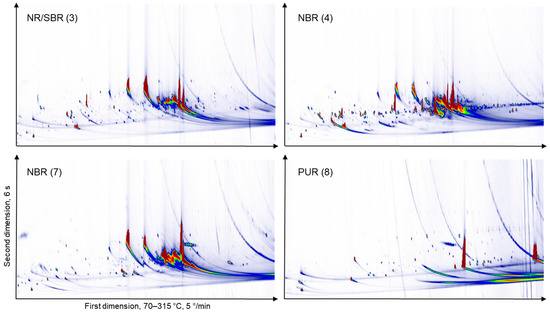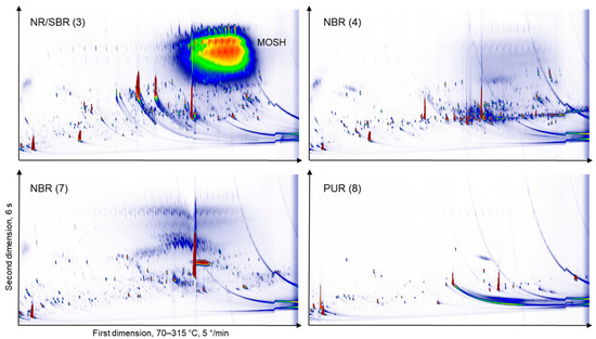 GC × GC-FID chromatograms of a selection of THF extracts without depletion of mineral oil saturated hydrocarbons (MOSH) or mineral oil aromatic hydrocarbons (MOAH) by PTV injection. NR/SBR (natural rubber/styrene-butadiene rubber); NBR (acrylonitrile butadiene rubber); PUR (polyurethane rubber); SBS (styrene-butadiene-styrene).