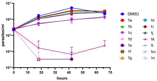 All fourteen compounds 1a–1n were tested at 50 µM concentration against the kinetoplastid parasite T. brucei brucei. Cultured long slender bloodstream form T. brucei were used for these experiments, as this form most closely represents the stage present in the mammalian host. Of the fourteen compounds analyzed, including 1j that was previously shown to inhibit T. brucei at higher concentrations [6], compounds with trifluoromethyl substitution (1d, 1e), bromo substitution (1f, 1g), and para-methyl substitution (1k) strongly inhibited growth of trypanosomes within the first 18 h (Figure 4; a table of the raw data is in the Supplementary Material). In fact, these compounds not only inhibited growth but killed parasites, with the para-bromo substitution (1f) killing parasites the quickest. Interestingly, the para-methyl substitution (1k) strongly inhibited parasite growth, while the meta-methyl substitution (1l) only showed a subtle effect on parasite growth. This may indicate that the substituent in the para-position may be able to bind more favorably than the meta-position, although more studies would be needed to confirm this. In summary, compounds 1d, 1e, 1f, 1g, and 1k strongly inhibited parasite growth at a concentration of 50 µM and are good candidates for further study.