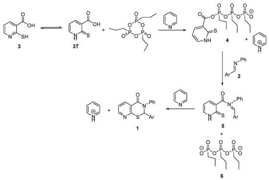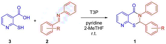 There are only a modest number of 2,3-dihydro-4H-pyrido[3,2-e][1,3]thiazin-4-ones reported in the literature, and the number grows quite small when there is an aryl group on the nitrogen of the 1,3-thiazin-4-one ring [1,2,8,9,10]. A common method used for preparation of a variety of 2,3-dihydro-4H-1,3-thiazin-4-ones is the cyclization of an imine with a 3-thiocarboxylic acid [11]. However, it is known that N-aryl imines are less reactive in the preparation of similar 2,3-dihydro-4H-1,3-thiazin-4-ones than N-alkyl imines [12,13,14]. Furthermore, Dandia et al. reported in 2004 that reaction of N-aryl imines with thionicotinic acid (2-mercaptopyridine-3-carboxylic acid) 3 by thermal methods with various catalysts and solvents failed, which they attributed to the “low reactivity” of 3 [9]. Dandia et al. succeeded in their reactions by using microwaves at 132–145 °C [9]. Arya et al. have reported success with ZSM-5-([MIM]+BF4−), a Brønsted acid ionic liquid catalyst, plus ultrasonication at 95 °C [1,8].