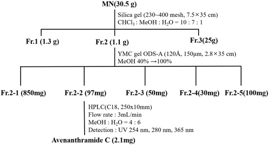 Procedure of Avn-C extraction. MN, methanolic extract; HPLC, high-performance liquid chromatography. Fr. 2, Avn-C-rich fraction; Avn-C, avenanthramide C; Avn-A, avenanthramide A; Avn-B, avenanthramide B.