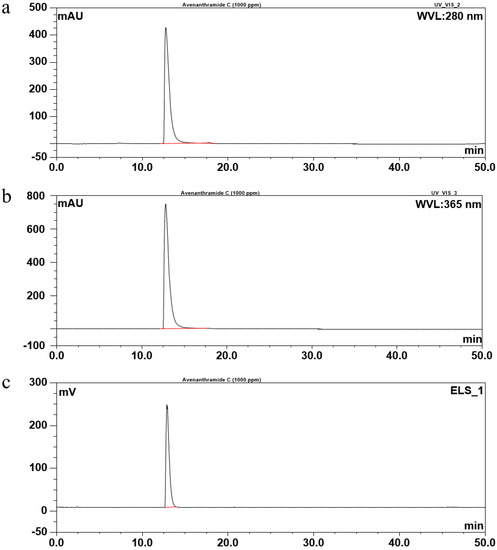 HPLC chromatograms of Avn-C isolated from Fr. 2. Avn-C was detected by UV 254 nm (a), UV 365 nm (b), and ELSD (c).