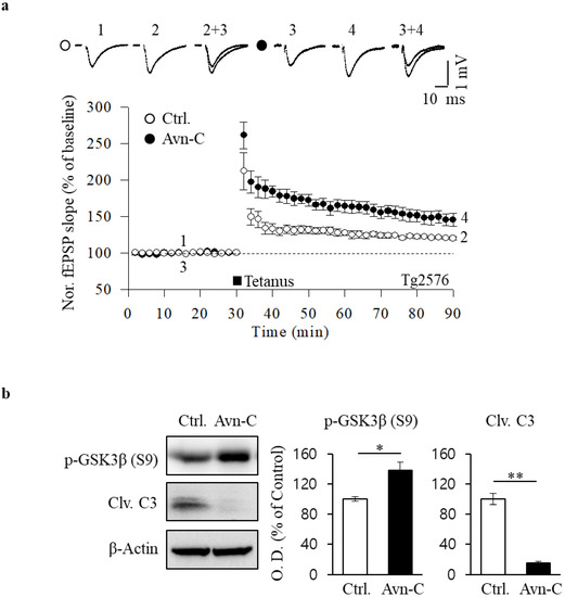 AD brains contain excessive Aβ levels linking the hallmarks to synapse damage and disease progression [34]. Even though the accurate mechanisms of Aβ impairs synaptic function are not fully understood, it is believed that acute exposure of hippocampal slices to Aβ inhibits LTP by activating caspase-3 and GSK3β [35]. To gain further insight into the mechanisms of enhancement of LTP in Avn-C-treated Tg2576 mice, we performed Western blotting experiments on hippocampal slices in the presence of Avn-C. Protein levels of p-GSK3β (S9) were increased and those of cleaved caspase-3 (Clv. C3) were decreased in the Avn-C treated hippocampus (Figure 5b), suggesting that Avn-C works as an inhibitor to suppress the abnormal activities of GSK3β and caspase-3 in an AD model mouse brain. This further supports that the mechanism underlies Avn-C rescues Aβ-inhibited LTP by modulating GSK3β and caspase-3 expressions.