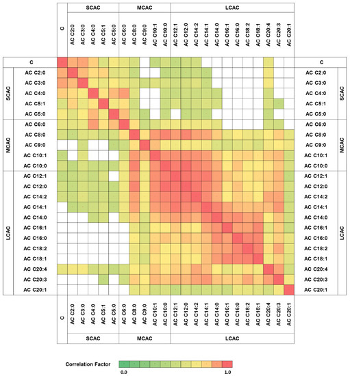 Carnitine and acylcarnitines correlation network. Only statistically significant correlation factors were presented (p < 0.05). AC—acylcarnitine; C—carnitine; SCAC—short-chain-length acylcarnitines; MCAC—medium-chain-length acylcarnitines; LCAC—long-chain-length acylcarnitines.