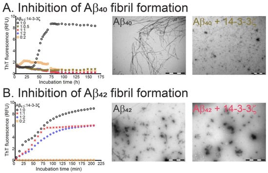 The following are available online. Figure S1: Amyloid fibril formation, as monitored by ThT fluorescence, of seeded Aβ40 (15 μM) in the absence and presence of 14-3-3ζ at 1.0:1.0–4.0 molar ratios of Aβ40:14-3-3ζ, Figure S2: Amyloid fibril formation of A53T α-syn (70 μM) in the absence of 14-3-3ζ and at a 1.0:1.0 molar ratio of A53T α-syn:14-3-3ζ, as monitored by ThT fluorescence and TEM.