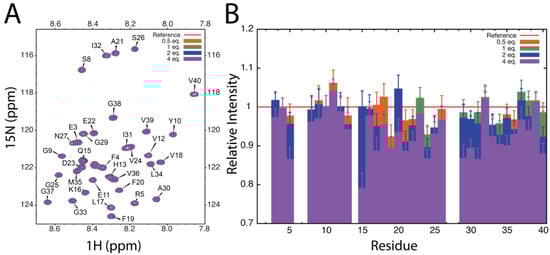 Figure 2a shows the 1H-15N HSQC spectrum of 15N-labeled Aβ40 at physiological pH and 5 °C, in the absence and presence of unlabeled 14-3-3ζ, at up to a four-molar excess of the chaperone protein. The NMR experiments were conducted at a low temperature to negate (or minimize) the possibility that Aβ40 would form amyloid fibrils during the timeframe of acquisition of the spectra. Thus, the NMR experiments monitored interactions between Aβ40 and 14-3-3ζ at the earliest stage of Aβ40 amyloid fibril formation.