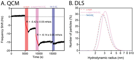A quartz crystal microbalance (QCM) measures the mass change of a surface upon the addition or removal of molecules as monitored by the change in frequency of a quartz crystal resonator. QCM was used to monitor the change in mass of WT α-syn preformed amyloid fibrils attached to the crystal upon flowing solutions of monomeric α-syn, an equimolar ratio of α-syn:14-3-3ζ and 14-3-3ζ itself over the crystal. The rate of change of frequency was essentially the same for the addition of α-syn in the absence or presence of 14-3-3ζ (Figure 3a), indicating that α-syn monomers bound to the α-syn fibrils on the crystal surface (thus increasing their size and mass), a process that was not affected by the presence of 14-3-3ζ. 14-3-3ζ did not bind to the α-syn fibrils. Thus, if any interaction between the two proteins occurs, it does so early along the aggregation pathway of α-syn, as with the interaction between α-syn and the sHsp, αB-crystallin [32,33]. The dynamic light scattering (DLS) profiles of WT α-syn and 14-3-3ζ were similar, with hydrodynamic radii at 37 °C and pH 7 of 2.789 ± 0.003 nm for WT α-syn and 2.818 ± 0.003 nm for 14-3-3ζ. The latter value compares well with the literature [8,34]. When both proteins were mixed together at an equimolar ratio, however, a single peak was observed at the larger hydrodynamic radius of 3.062 ± 0.001 nm (Figure 3b), implying some association between the two proteins under physiological conditions.