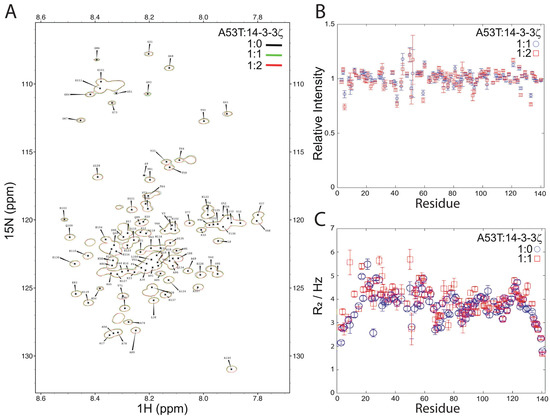 The transverse (spin-spin) 15N relaxation rate (R2) of 15N-labeled A53T α-syn cross-peaks in the absence and presence of a molar equivalent of 14-3-3ζ was determined (Figure 4c). Interaction between the two proteins, even if transient, will alter (most likely increase) the R2 values of the residues involved. On average, there was a slight increase in R2 values for A53T α-syn in the presence of 14-3-3ζ which was concentrated in the first 50 or so amino acids, in agreement with the cross-peak intensity data in Figure 4b, i.e., comparison of R2 values in the absence and presence of 14-3-3ζ was consistent with an interaction between the two proteins that mainly involved the N-terminal region of A53T.