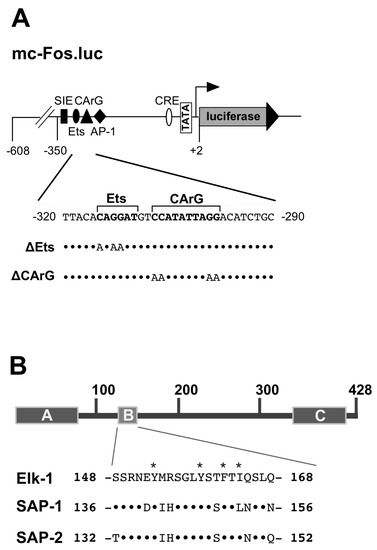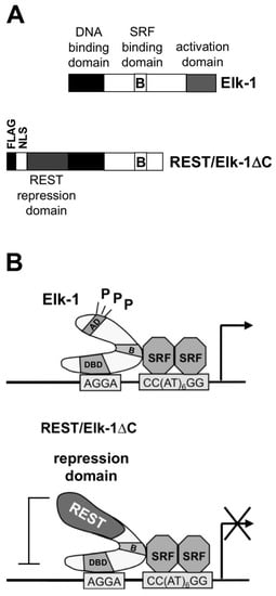 Cells express receptors and ion channels to enable communication with their environment. The stimulation of cells with hormones, neurotransmitters, cytokines, mitogens, nutrients or metabolites can change their genetic program. This stimulus-regulated gene transcription allows cells to respond to extracellular stimuli that are released by other cells of the organism. Protein kinases function as signal transducers, leading to the activation of stimulus-responsive transcription factors that bind to specific genetic elements. One of these elements is the serum-response element (SRE) (Figure 1A), which facilitates gene transcription as a result of cellular stimulation by extracellular signaling molecules. The SRE is the binding site for the serum response factor (SRF) and the transcription factor Elk-1 or related ternary complex factors (TCFs) (Figure 1A) [1,2]. An SRF dimer binds to the CArG box with the consensus sequence CC[A/T]6GG, while the TCF proteins interact with the Ets consensus core sequence GGAA/T, typical for the transcription factors of the ETS family. It has been suggested that the binding of Elk-1 to DNA involves phosphorylation [3]. However, recent chromatin immunoprecipitation (ChIP) data showed that unphosphorylated Elk-1 binds to DNA under basal conditions [4,5]. Likewise, the generation of the ternary complex between Elk-1 and SRF occurs independent of Elk-1 phosphorylation [6].