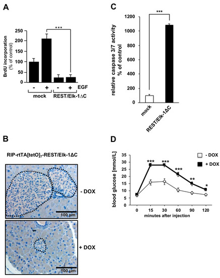 Elk-1 regulates the proliferation and apoptosis of several cell types, including astrocytes, fibroblasts, and pancreatic β-cells [8,21,22]. In primary astrocytes, the expression of the dominant-negative Elk-1 mutant REST/Elk-1ΔC completely blocks epidermal growth factor (EGF)-induced proliferation of the cells [21] (Figure 4A), indicating that Elk-1 activity is required for the mitogenic activity of EGF. The expression of REST/Elk-1ΔC in pancreatic β-cells of transgenic mice revealed that transgene expression resulted in the generation of significantly smaller islets (Figure 4B) [8]. Thus, an expression program involving Elk-1 or related TCF proteins is essential for the generation of islets of normal size. Expression of the dominant-negative mutant of Elk-1 strongly activates caspase-3/7 (Figure 4C), enzymes that play critical roles in the execution phase of apoptosis. Thus, the activation of apoptosis is responsible for the generation of smaller islets in transgenic mice expressing the dominant-negative mutant of Elk-1 in pancreatic β-cells. As a result, the transgenic mice showed impaired glucose tolerance [8] (Figure 4D). Elk-1 activity has additionally been connected with the regulation of adipogenesis, thymocyte development and brain function [17,20,23,24]. Several proteins of the ETS family of transcription factors have been linked to tumor development and cancer [1]. The expression of v-ets, encoded by the E26 virus, results in the development of erythroid and myeloid leukemias. The ETS proteins PEA3 and ERG have been proposed to induce Ewing sarcomas and prostate cancer, respectively. Elk-1 has been proposed to play a role in different cancer types. However, the published studies do not allow for a general statement to be made regarding a correlation between Elk-1 and tumor development.