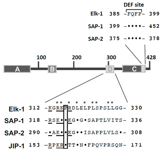 Protein kinases have been characterized by their recognition of a particular consensus site which includes the phosphorylated residue. Often, short sequence motifs are recognized (e.g., the S/T-P site for the proline-directed MAP kinases). These motifs are often found several times in a protein, indicating that the recognition sequence alone cannot provide protein kinase specificity. Moreover, MAP kinases recognize similar consensus sites. Thus, the interaction of MAP kinases with other sites of the substrate proteins must occur in order to increase substrate affinity and provide protein kinase specificity. Elk-1 has at least two protein kinase docking sites, the D-sites (or D-domain, D-Box) and the DEF site. The D-domain encompasses a stretch of basic residues, a central proline residue and a cluster of hydrophobic residues known as the docking groove [35] (Figure 7). These sites are either conserved in the SAP-1 and SAP-2 molecules or replaced by similar charged residues (exchange of a lysine residue for an arginine residue). The D-box also functions as an ERK2 docking site in a heterologous context [44,45]. Activation of ERK2 is required for efficient binding to the D-box of Elk-1 [44]. ERK2 and JNK bind to similar and distinct amino acids of the D-box of Elk-1. Alanine scanning mutations underlined the importance of the basic amino acids R314 and K315 of Elk-1 N-terminal of the proline residue P316 and the residues R317 and L319 C-terminal of this proline residue for the binding of ERK2 and JNK. Mutation of the LEL cluster (amino acids 319–321) significantly reduced the docking function of the D-box [46]. Mutation of residues L323 and S324 revealed an impairment of JNK-induced Elk-1 phosphorylation. Additionally, exchange of the leucine residues 327 and 328 of Elk-1 with alanine residues completely blocked ERK2- and JNK-mediated Elk-1 phosphorylation, suggesting that these residues are also involved in MAP kinase docking. The leucine residues are not conserved in SAP-1 and SAP-2 but replaced by other hydrophobic amino acids (Figure 7). Figure 7 depicts for comparison the JNK binding site of the JNK-interacting protein JIP-1, showing that the N-terminal part of the D-box, including the stretch of basic amino acids, the proline residue and the cluster of hydrophobic amino acids, can be found in this protein as well [45]. In contrast to ERK2 and JNK, the p38 protein kinase does not use the D-box to bind to Elk-1 [45].