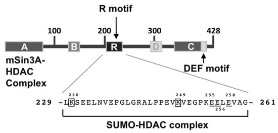 Elk-1 contains two distinct repressor domains. The N-terminal repressor domain recruits the corepressor protein mSin3A, complexed with histone deacetylases, to the N-terminus of Elk-1. The binding of both mSin3A and histone deacetylases is stimulated by the phosphorylation of Elk-1. The R motif represents a repression domain of Elk-1 that functions as a binding site for a SUMO–HDAC-2 complex. SUMO binding requires the lysine residues K230 and K249 (boxes) and a stretch of acidic residues (bars). The sequence information is derived from Ref. [7].