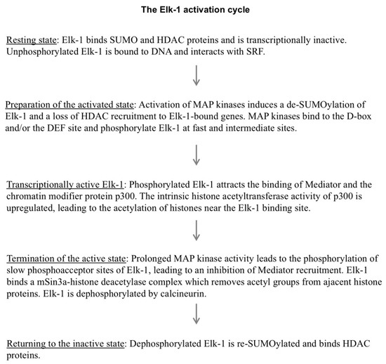Elk-1 is a DNA binding protein that interacts with a genetic element termed the “serum response element”. Biochemical and genetic investigation showed that the biological activity of Elk-1 is controlled by numerous protein–protein interactions. In fact, protein–protein interaction with the serum response factor may replace Elk-1–DNA interaction in some signaling pathways. Elk-1 is kept in an inactive state under basal conditions via the binding of a SUMO–histone deacetylase complex. A model has been formulated according to which Elk-1 exists under basal conditions as a “transcriptionally poised complex” [59] that is rapidly activated by cellular stimulation. The activation of MAP kinases, particularly ERK1/2, triggers a de-SUMOylation of Elk-1, leading to the phosphorylation and activation of Elk-1. The transcriptional activation potential of phosphorylated Elk-1 is enhanced by the interaction with subunits of the Mediator complex and binding of the histone acetyltransferase p300, leading to changes of the chromatin architecture. Strong and extended phosphorylation of Elk-1 attenuates Mediator recruitment and transcriptional activation by attracting the mSin3A–histone deacetylase complex. Moreover, phosphorylated Elk-1 is dephosphorylated by the Ca2+/calmodulin-dependent protein phosphatase calcineurin. Dephosphorylated Elk-1 is then re-SUMOylated to put Elk-1 back into an inactive state, waiting for the next cycle of stimulation and activation (Figure 10).