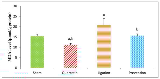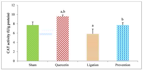 The antioxidant of the CAT activity in the group of sham, quercetin, ligation, and prevention was 7.72 ± 0.68, 9.60 ± 0.29, 5.84 ± 1.02, and 7.69 ± 0.55 U/g protein, respectively (Figure 8). Relative to the ligation group, the CAT value was significantly increased in the prevention group (p < 0.05).