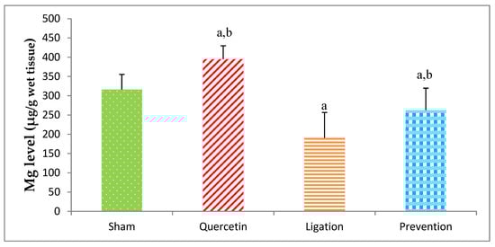 The Mg level in the sham, quercetin, ligation, and prevention groups was 316.04 ± 39.10, 394.71 ± 34.89, 190.58 ± 66.14, and 262.45 ± 57.28 μg/g, individually. A significant (p < 0.05) high Mg level was found in the prevention group as compared to the ligation group (Figure 2).