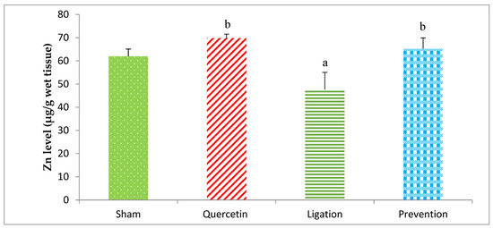 The Zn concentration in the group of sham, quercetin, ligation, and prevention was 61.99 ± 3.06, 69.78 ± 1.72, 47.59 ± 7.42, and 65.15 ± 4.74 μg/g, respectively (Figure 3). The Zn concentration was obviously (p < 0.05) high in the prevention group relative to the ligation group.