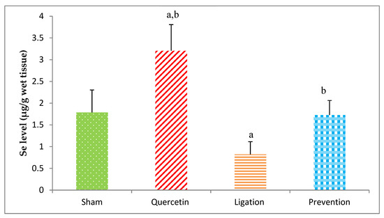 As listed in Figure 4, the Se level in the group of sham, quercetin, ligation, and the prevention was 1.78 ± 0.51, 3.20 ± 0.60, 0.820 ± 0.29, and 1.72 ± 0.33 μg/g, respectively. As compared to ligation group, the Se level was significantly elevated (p < 0.05) in the prevention group.