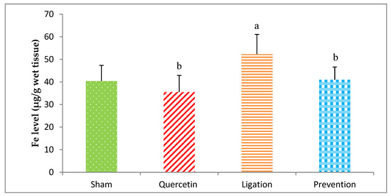 The Fe level in the group of sham, quercetin, ligation, and prevention was 40.43 ± 6.90, 35.54 ± 7.37, 52.34 ± 8.69, and 40.98 ± 5.67 μg/g, respectively. A statistical decrease (p < 0.05) of the Fe level was showed in the prevention group relative to the ligation group (Figure 5).