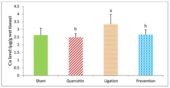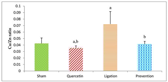 The Cu level in the group of sham, quercetin, ligation, and prevention was 2.62 ± 0.44, 2.48 ± 0.23, 3.34 ± 0.64, and 2.65 ± 0.32 μg/g, individually (Figure 6). Relative to the ligation group, the Cu level was markedly low (p < 0.05) in the prevention group.