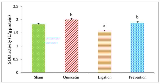 The SOD value obtained from the group of sham, quercetin, ligation, and prevention was 1.82 ± 0.04, 2.00 ± 0.04, 1.56 ± 0.03, and 1.87 ± 0.05 U/g protein, respectively. As compared to the ligation group, the SOD activity was statistically higher (P < 0.05) in the prevention group (Figure 7).