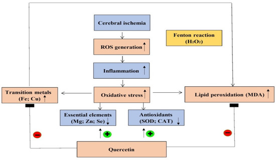 Our findings reveal that a disruption in the balance between essential element concentrations and depletion of antioxidant activity are indeed involved in the pathophysiology of acute ischemic stroke. Further, we observed the fact that the neuroprotective mechanism of quercetin during acute cerebral ischemic injury is associated with increasing the concentrations of the essential elements Mg, Zn, and Se and the antioxidant enzymes SOD and CAT and decreasing the concentrations of malondialdehyde (MDA), Fe, Cu, and the Cu/Zn ratio in the ipsilateral brain cortex.