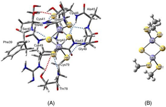 In order to clarify the effect of the hydrogen bonds, a naked cluster model in which the four cysteines attached to the Fe ions are replaced by methanethiolate (CH3S−) ligands is also constructed as illustrated in Figure 1B. Here the model structures with/without the 11 hydrogen bonds are abbreviated as 1H and 1N, respectively. Furthermore, the effect of each hydrogen bond is also examined by changing amino acid residues in the model structure as explained below. The Cartesian coordinates of 1H are summarized in Supplementary Materials Table S1.