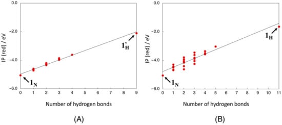 The relationships between the number of hydrogen bonds and calculated IP(red) values. (A) The peptide models. (B) The amino acid models.