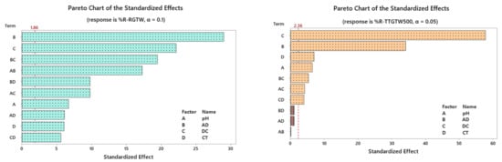To test whether a variable was statistically significant and affected the measured response(s), a Pareto chart was employed (Figure 1). The impact of the variables affecting the removal efficiency of RGTW was different compared to the same response in the case of TTGTW500. For example, in the case of having the %R as the assessed response, the RGTW dose (AD, B) was the most statistically significant variable, as opposed to the concentration of MB (DC, C) in case of TTGTW500. Similar influences could be observed in case of qe. Since the Pareto chart does not show the direction of the response, other quality charts (normal and half-normal plots) were used (figures not shown). Analogous conclusions were drawn from the ANOVA testing, where variables having p-values less than 0.05 were considered statistically significant (table not shown). It is worth mentioning that the measured responses were obtained following a Box-Cox response transformation [28], either alone or together with stepwise analysis.