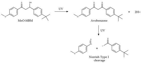 The aim of a transformer material is to slow down the UV-dependent diminution of the SPF, ideally directly on human skin. This is achieved by the conversion of MeO-MBM, which is not a UV filter material, into avobenzone via UVA/B exposure. After further UVA/B irradiation, the photoketonization process of avobenzone is initiated, leading to the Norrish-type I cleavage (Figure 1). This photodegradation is a known process mainly attributed to the formation of diketone radicals under UVA at wavelengths between the UVA I region (340–400 nm) and UVA II region (320–340 nm) accompanied by the loss of function of the UV protective effect of avobenzone.
